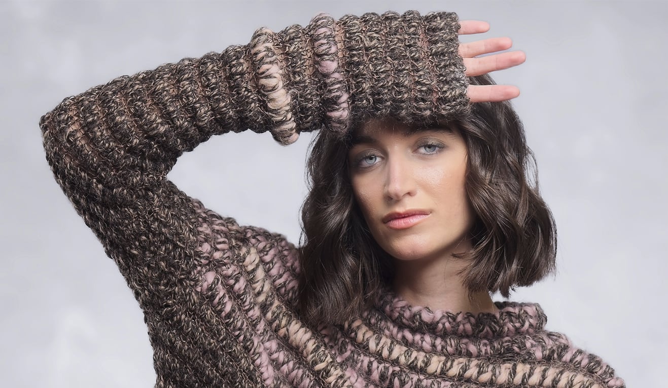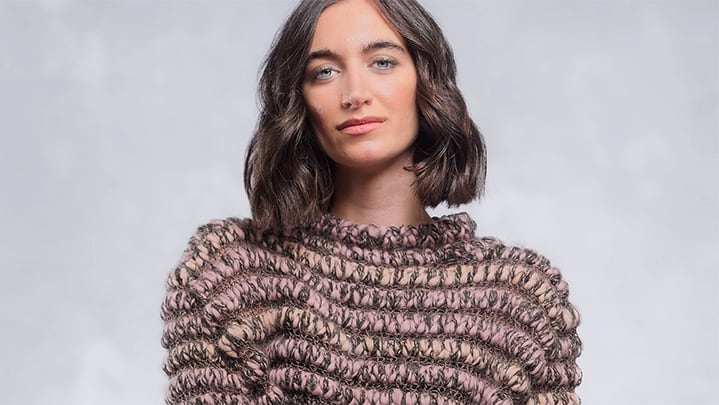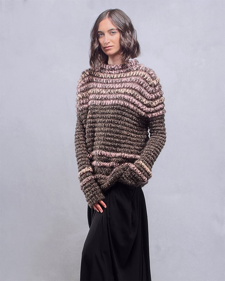 An open, undulating knit reveals soft pink and sand tones across the body and sleeves, creating a balanced and pleasant surface.